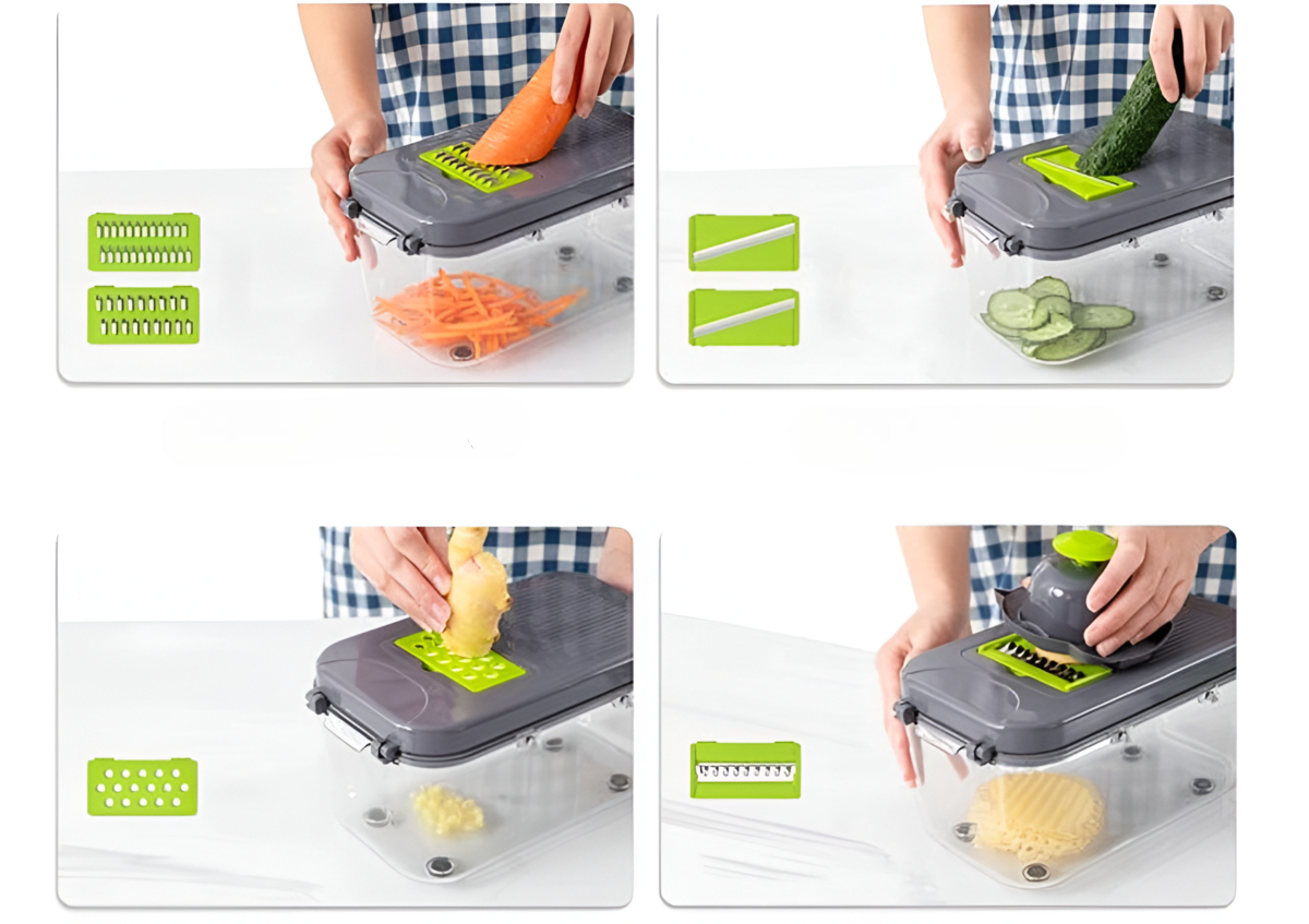 Acest set complet include 5 lame de dimensiuni cuburi, 2 lame de feliere (netede si ondulate), 2 lame cu filament (grosier si mic), 1 grila pentru felii de cartofi, 1 lama pentru ghimbir ras si 1 separator de oua. Indiferent daca doresti sa prepari salate colorate, garnituri atragatoare sau sa-ti surprinzi familia cu mancaruri delicioase, aceasta razatoare multifunctionala iti ofera toate instrumentele necesare pentru a realiza preparate cu aspect profesional.