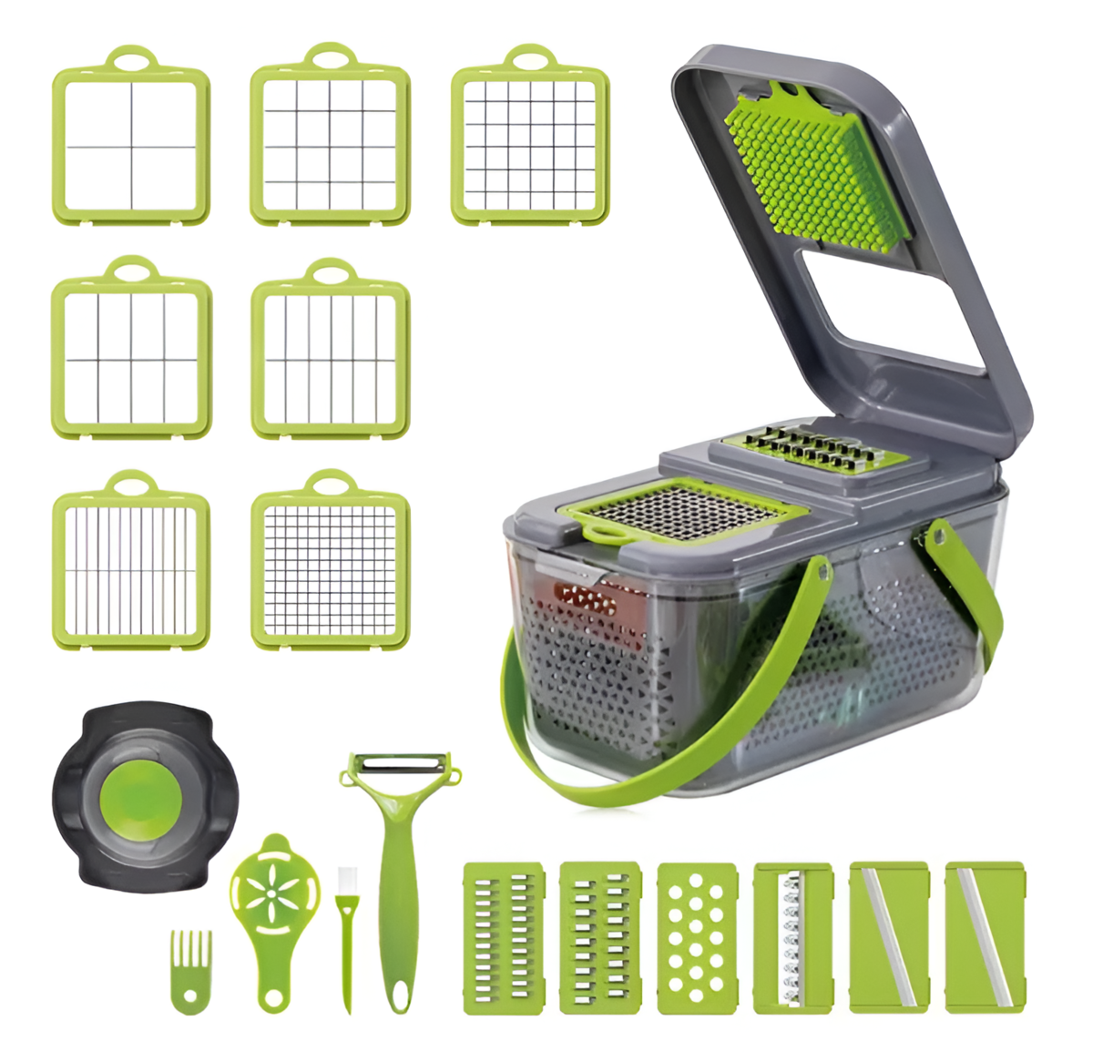 Cu functii multiple si o constructie durabila, Razatoarea Multifunctionala de 22 de Piese este instrumentul perfect pentru a economisi timp si a crea preparate culinare deosebite in fiecare zi. Simplifica-ti experienta in bucatarie cu acest set versatil si practic, care iti va face viata mai usoara si mai placuta.
