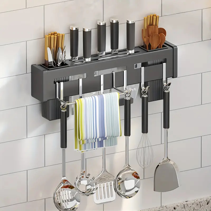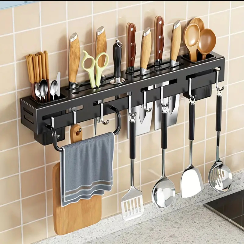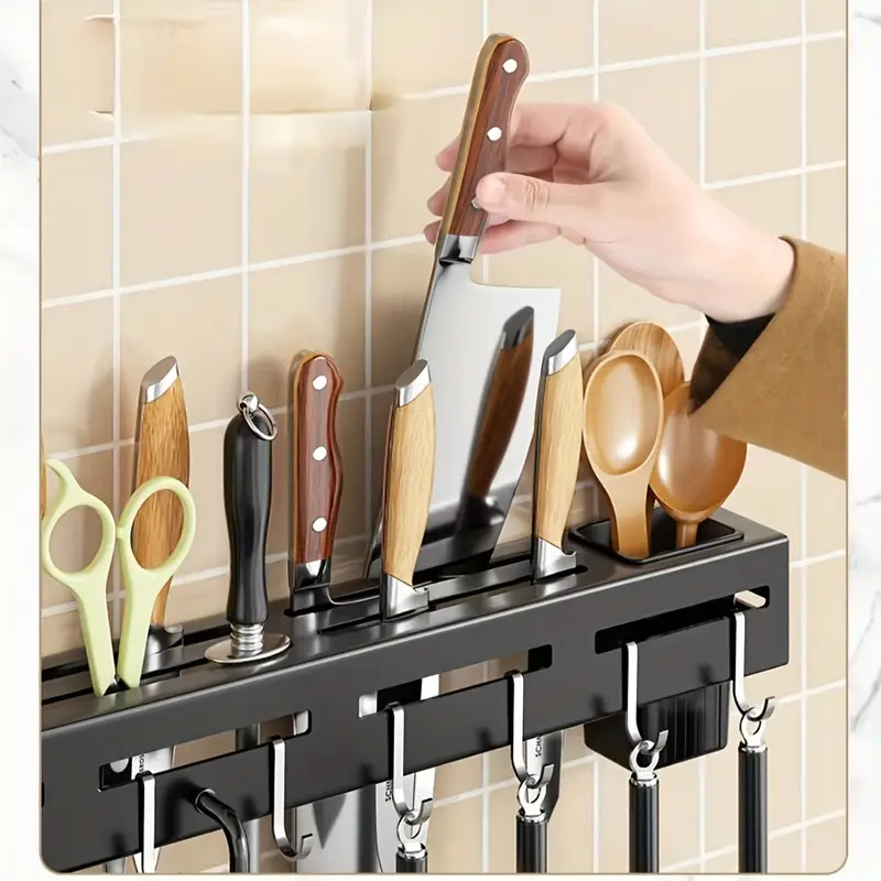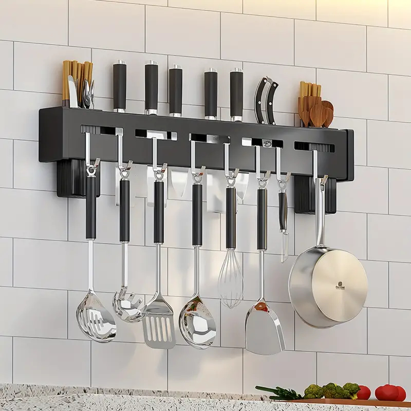 Organizator de Perete pentru Bucatarie, eSimplu®, cu 8 Carlige Agatare, Suport Cutite, Negru